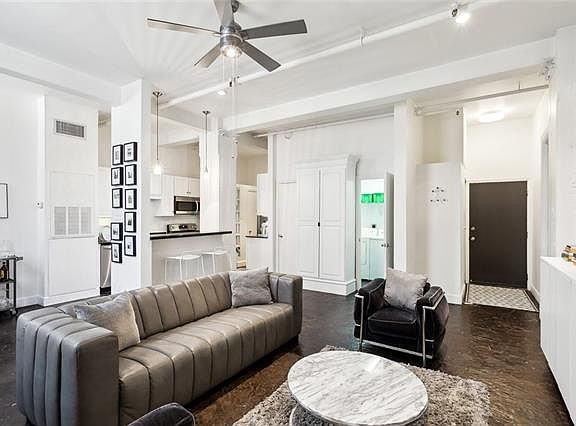 Walk right in to this Warehouse District beauty and immediately start living in this fully-furnished unit with so much pizzazz. Tons of natural light, well chosen art work, white walls, 11' ceilings and scored concrete flooring throughout. Large living area features stylish leather sofa, velvet side chairs, storage cabinets and television. The recently renovated kitchen includes stainless steel appliances, black granite counters and a breakfast bar with stools. Cabinets are stocked with glassware, cookware, flatware, and coffee maker. There are 2 walk-in closets and laundry room has extra storage space. Primary bedroom has queen bed, private bath and large closet. Second bedroom is set up as an office but could be converted back to a bedroom. Secure gated building with FOB key entry system. The well-maintained building boasts full ground-floor gym just a few doors down, open air atrium, gorgeous roof-top heated swimming pool with amazing city views and a deck with grill area. Gated assigned parking space included. Quick access to the French Quarter, Harrah's, CBD, Museums and Universities. Across from Heritage Park and walking distance to the New Orleans' Convention Center.