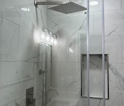 Terrific master bath featuring a ceramic tile shower with a rain shower head, plus a brand-new vanity and sink for a fresh, modern feel.