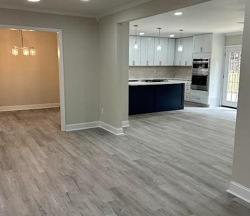 The stunning kitchen is a true centerpiece, boasting brand-new cabinetry with soft-close doors and drawers, a center island with seating for barstools, a cooktop with downdraft and pendant lighting! Quartz countertops, stainless steel appliances, new refrigerator and a convenient wall oven/microwave combo—all seamlessly open to the family room, breakfast nook, and living area.