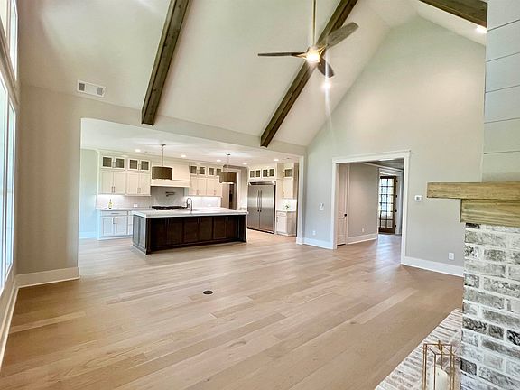 Indoor gas fireplaceUpscale finishesCraftsman-style homeHardwood floorsCenter islandDecorative beamsWalk-in pantry