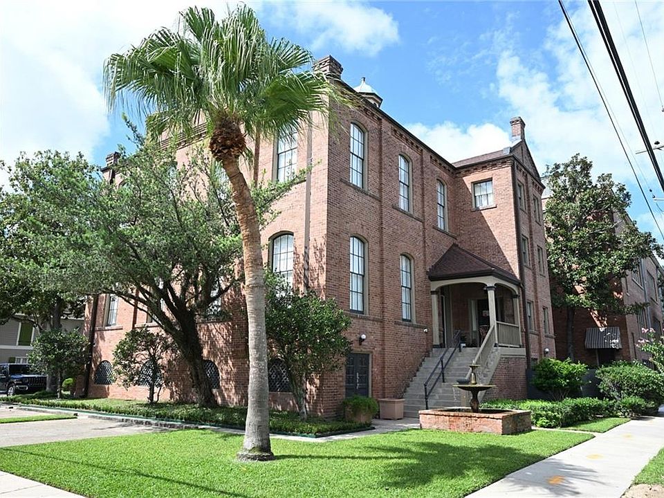 Own a rare piece of history in this converted school building once known as McDonogh Memorial School built in 1893-1894. Its brick structure blends Queen Anne & Colonial Revival architectural styles and is located in a premier Uptown location. This unique 1st floor condo has 2 bedrooms, 2 baths, assigned parking and a private entrance into your fenced in exclusive courtyard that overlooks the open living/dining area making it an ideal space for entertaining. The kitchen has a spacious breakfast bar, pantry, stainless steel refrigerator w/ice maker, 5 burner stove w/hood, dishwasher, microwave & washer/dryer! Timeless interior brick walls are showcased in the primary suite w/a large walk-in closet & full bathroom. The 2nd bedroom has 9'7" ceilings, walk-in closet, full bathroom & linen closet. Other features include wood floors, rounded wall corners, onsite storage space & shared workout room. Brand new shingle roof to be installed this month (October) & new flat roof was installed in Oct 2022. This is a well established Association with solid financials. Walk only 2-1/2 blocks to Magazine St or Prytania St & 4 blocks to St Charles Ave where there are plenty of restaurants, boutiques, galleries & nearby things to do! Enjoy living the true Uptown lifestyle in this high demand building & area!