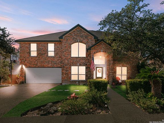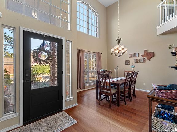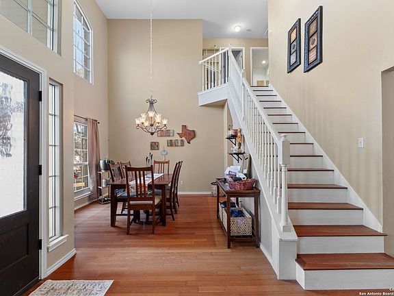 Gorgeous home with a pool in the centrally-located Oaks at Vista del Norte gated community located on a low traffic cul-de-sac. Ideal for a growing family, this beauty offers plenty of space for everyone. The open floorplan with high ceilings and natural light create a wonderful flow. Three living areas including cozy family room with fireplace, downstairs flex office space, plus a formal dining, and a loft game room upstairs. Downstairs fourth bedroom is ideal for generational living or as a guest suite. Generously sized secondary bedrooms upstairs. Beautiful wide-planked wood flooring throughout home. Large primary suite upstairs with access to balcony overlooking a park-like backyard. Enjoy endless Summer days relaxing around the lap pool and picnicking under the pool-side pavilion. Fresh exterior paint in 2025. Roof and HVACs replaced within the past 5 year. Community playground and picnic area. NEISD schools, easy access to Wurzbach Pkwy. and Hwy. 281, insulated from heavy traffic flow. Convenient to shopping and restaurants.