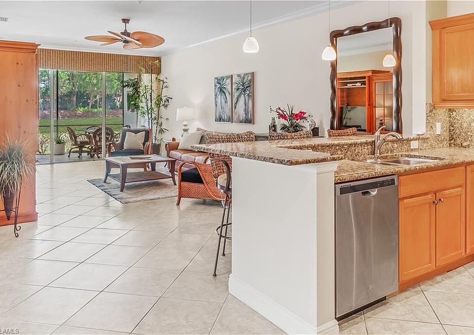 End-unit with Lake & Golf Views on a Quiet Cul-de-sac and GOLF INCLUDED! Enjoy the best of Florida living in this beautifully updated TURNKEY first-floor, end-unit condo featuring 2 bedrooms, 2 full baths, and a versatile flex room—perfect as a den, home office, or guest space. With sweeping views of the lake and golf course, the screened lanai faces southwest, offering breathtaking sunsets and serene privacy. This open-concept floorplan is designed for both relaxed living and effortless entertaining, with split bedrooms ensuring guest comfort and privacy. Located in the highly desirable bundled golf community of Vasari, residents enjoy golf, tennis, a state-of-the-art fitness center, luxurious resort-style pool and spa, and a vibrant clubhouse—all included! Ideally situated near award-winning Gulf beaches, lively 5th Avenue in Naples, and just a short drive to RSW Airport. With an abundance of dining, arts, shopping, and nature trails nearby, this home is the perfect blend of relaxation and recreation.