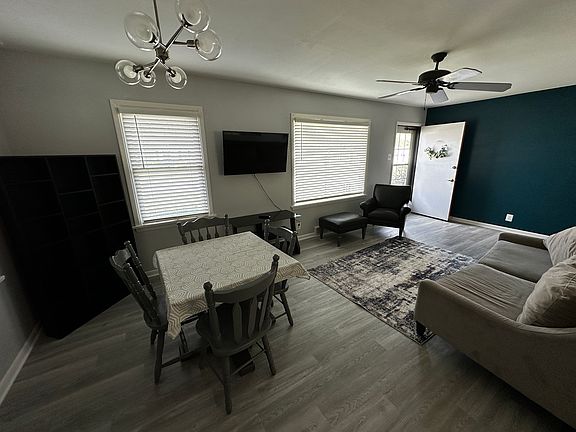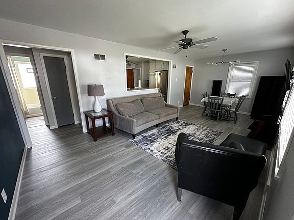 Fully furnished, recently renovated, updated cute blue single family home. 864 square feet on the main floor + 600 square feet finished basement which could easily become a 3rd bedroom. Bar and entertainment area available downstairs in addition to 3rd bedroom area. 2 full size closets and abundant storage. Half bath located downstairs. Covered Carport. Covered full size outdoor patio with table and chairs. Fenced in, flat backyard. Brand new upscale appliances, HVAC and water heater. Landscaping included.