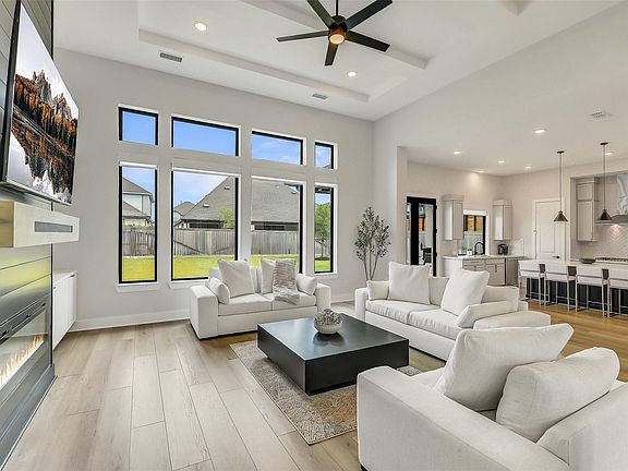 Discover modern luxury living in the sought-after Bridgeland community. This stunning 1.5-story home features an expansive layout with open-concept living spaces, high ceilings, and abundant natural light. The spacious family room has a sleek electric fireplace and built-ins, and it seamlessly connects to the gourmet kitchen featuring a center island, double ovens, ample cabinet space, and contemporary designer finishes. Sliding stacking doors open to a private courtyard, perfect for indoor/outdoor entertaining. All four bedrooms are conveniently located downstairs, each with its own walk-in closet, and the primary suite offers a spa-like bath. Upstairs, enjoy a large gameroom with a built-in desk, a media room, and half bath—an ideal retreat for movie nights or guests. A covered patio overlooks the spacious backyard. Located in award-winning Bridgeland where residents enjoy numerous amenities that include resort-style pools, parks, fitness centers, over 250 miles of trails, and more.