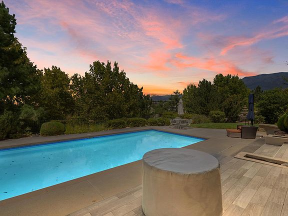 Stunning home in Tanoan's prestigious guard-gated golf course community! Completely reimagined and remodeled with the finest finishes throughout, including all new electrical, plumbing, roof, HVAC, appliances, and lighting. The open, redesigned floor plan showcases a gourmet kitchen with custom cabinetry, Sub-Zero & Wolf appliances, and elegant granite and marble surfaces. Expansive sliding doors open to the pool, golf course, lake, and Sandia Mountain views, creating a seamless indoor-outdoor experience. The luxurious primary suite offers a cozy fireplace, heated tile floors, soaking tub, and breathtaking views. Designer lighting, custom woodwork, and high-end fixtures complete this exquisite home. Surrounded by lush landscaping and updated pool systems and new exterior re-stucco.