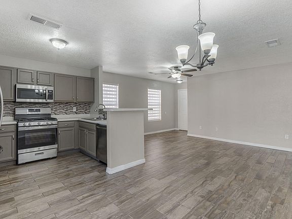 Wonderful move-in-ready single story home located in the Timarron community. Home features 1,146sf with 3 bedrooms, 2 bathrooms and a 2 car garage. Beautiful wood look tile throughout the home. Kitchen with refreshed gray cabinetry, stainless steel gas range, microwave, refrigerator, dishwasher and pantry. Dining space right off of the kitchen. Owners suite with his and hers closets and a private bath. Great backyard, fully fenced with a firepit, patio with pergola and a storage room with electricity! Easy access to restaurants and shopping!