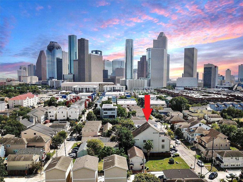 Unique duplex style setup, perfect for roommates or extended families, or even investors. Home is 3 bedrooms & 3 baths, but divided into a 1st floor studio apt and an upstairs 2/2 home. Downstairs apt is a private full 1 bedroom 1 bath unit with rear entrance, which was recently leased for 1,700 a month. Main home is on floors 2-4, which features 2 bedrooms/2 full baths, plus an expansive rooftop terrace with amazing downtown views. Main home was recently leased for 3,400 a month. It features a 2 story living room, a 3rd floor office area, and a primary suite on the 3rd floor. 1st floor apt has a separate washer/dryer area in the garage. Home has a tandem 2 car garage, with EV charging capabilities. Entire property was currently used as an investment, but could easily be used to live in 1 unit and rent out the other. Property comes with ALL appliances and turn-key for an investor, or owner-occupant. Extremely walkable to shops, restaurants, and parks, including Buffalo Bayou Park.