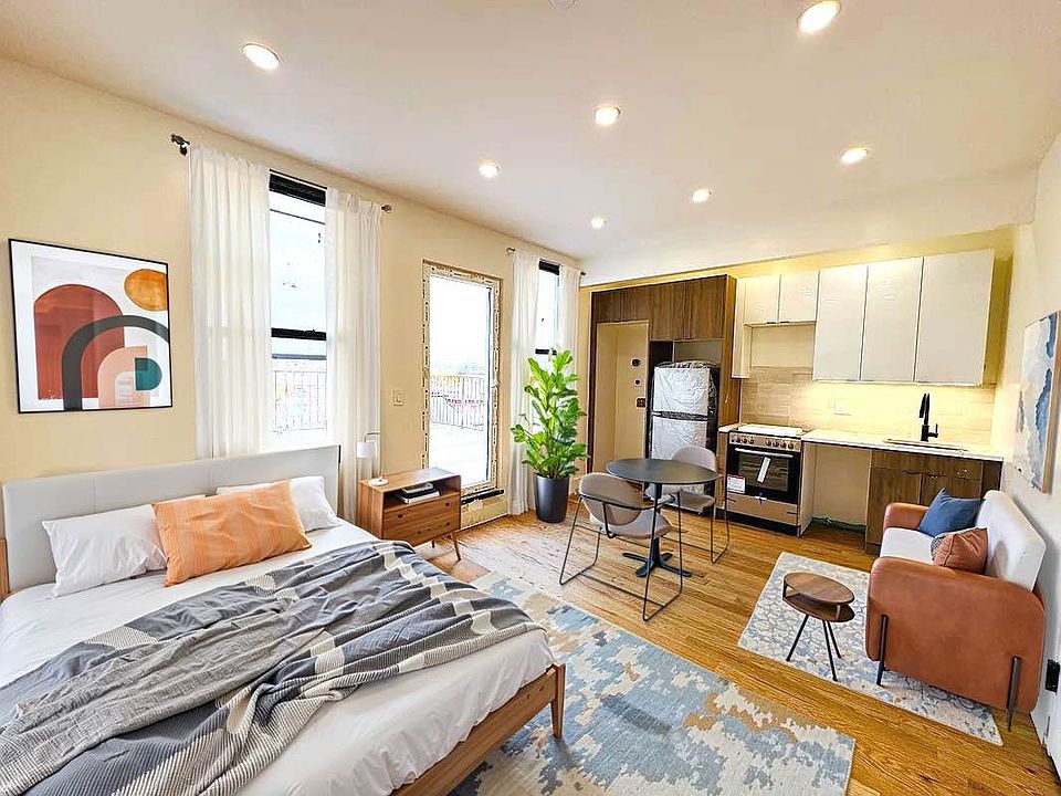 This beautiful Studio apartment has amazing natural light, high ceilings, full size kitchen with dishwasher built in microwave and washer, and dryer in unit