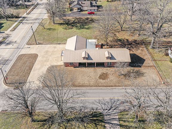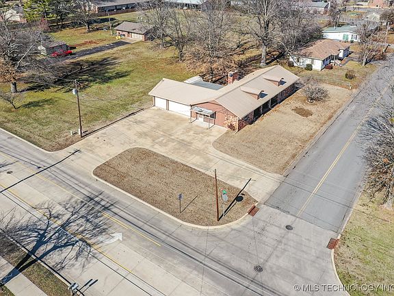 This property offers great potential for a home-based business. Situated on a corner lot with a large concrete circular drive, it provides excellent access & visibility, extra parking, plus separate entry from the main home. The side entry room, previously used as a workshop, could serve as an oversized office, gym, stock room or a 4th bedroom. The home is highly energy efficient, constructed of concrete blocks (not susceptible to termites), with a brick exterior, blown-in fiberglass insulation, a metal roof, updated with fiberglass windows & a heat pump with programmable thermostat. The kitchen has been completely remodeled with solid oak cabinets, glass tile backsplash, granite counters, composite double sink, stainless-steel appliances & fridge. Updates made to 2 bathrooms, each with a shower. Covered patios in front and backyard, fenced backyard with storage building, and an above-ground storm shelter located in the oversized, 3 car garage, & $5k in Leafguard Gutters with warranty. Water line has been replaced. Property is a six-minute drive to the new hospital or to Northeastern State University and less than 5 miles from the Illinois River. *Info believed to be accurate, Buyer to verify.*