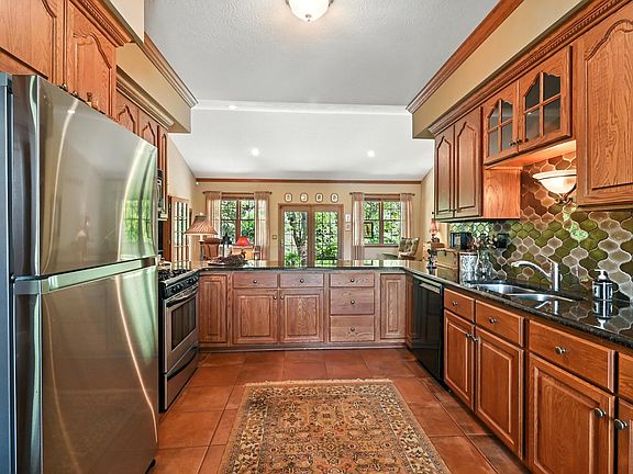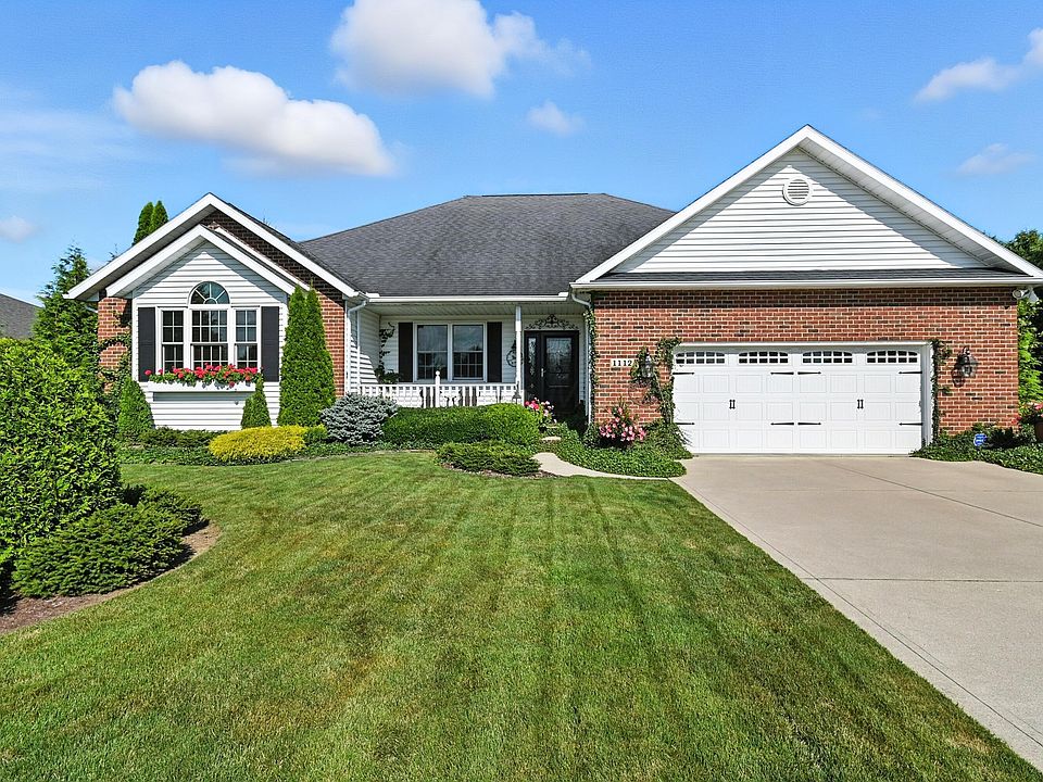 Welcome to this immaculately maintained ranch showcasing elegance, comfort, and timeless craftsmanship with the highest-quality finishes throughout. From the moment you arrive, you'll be captivated by the curb appeal and meticulously landscaped grounds, complete with evergreens that provide year-round privacy. Inside, rich cherry hardwoods flow seamlessly, complemented by custom cabinetry and detailed trim work. The central kitchen is designed for style and function with cherry cabinets, granite counters, stainless appliances, and a counter overlooking the family room—ideal for entertaining. Vaulted 9-foot ceilings create an airy feel, while the primary suite boasts a spa-like bath with walk-in shower and closet. A large den/office adds flexibility. Outdoors, a stunning patio and lush landscaping create a private oasis. Triple-pane windows enhance both efficiency and comfort, making this home as practical as it is beautiful.