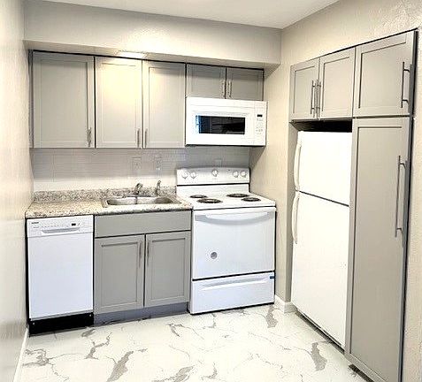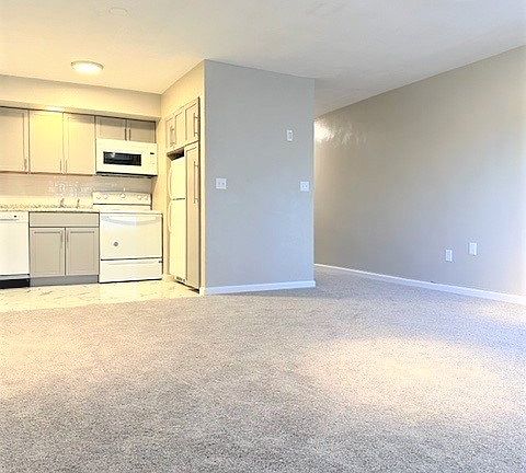 * New Kitchen Fully equip white appliances, tile flooring, new kitchen cabinets & countertops, garbage disposal, dishwasher, vented microwave, range, & fridge.