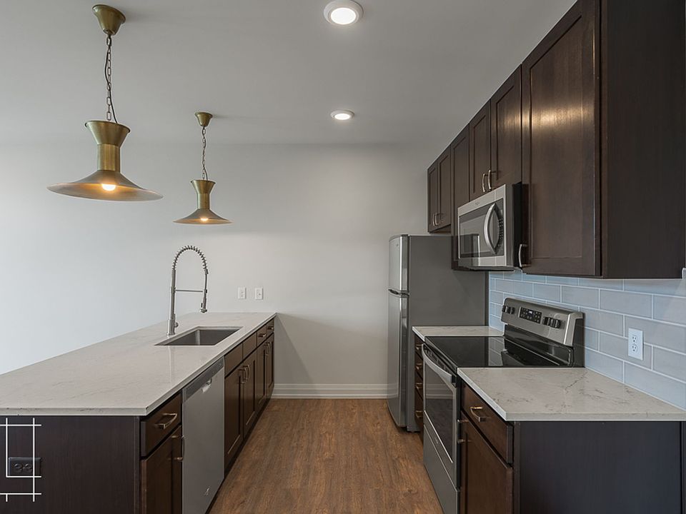 This top floor 1 bedroom/1 bath apartment is located in Italian Village. Our apartments start on the 2nd floor over a private residential garage. As you enter the apartment you will walk into your kitchen, you'll see we provided sleek granite counters, espresso cabinets, eye catching tile with stainless-steel appliances. Offering in-unit washer dryer and 9-foot ceilings that open up the room allowing natural light pour through the space with our oversized windows, all windows do come with roll down privacy shades as well. 4th Crossing has a roof top patio overlooking the downtown skyline. Our rooftop offers a grill space along with a fire pit, with ample seating perfect for those Ohio summer days.