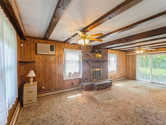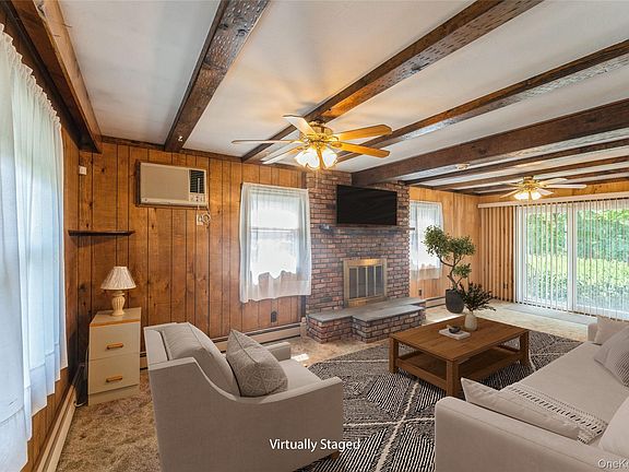Charming Colonial in N. Merrick backing up to a lush wooded area for the ultimate privacy! This 3 bedroom and 2 full bath home contains a convenient attached garage with access from the kitchen. The full basement provides a recreational space with a bonus outside entrance. The oversized living room is a canvas for all your entertaining needs with a fireplace and sliding glass doors to the fenced yard with patio. Alongside the kitchen, the formal dining room boasts hardwood floors and appealing ceiling wood beams that can be found throughout the entire main floor for added character to the home. Primary bedroom is abundantly large at 17x21 consisting of two closets and a hidden shelving area with window. With a great floor plan, generously sized rooms, and lots of natural light, this home has endless possibilities and an opportunity to make it your own!