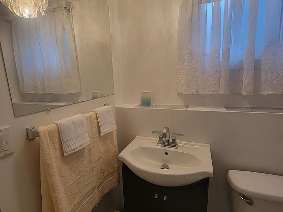 Soak in the bathroom's new tub or take a shower in the renovated area. The bathroom has porcelain and ceramic tiles and has bright window and chandelier.