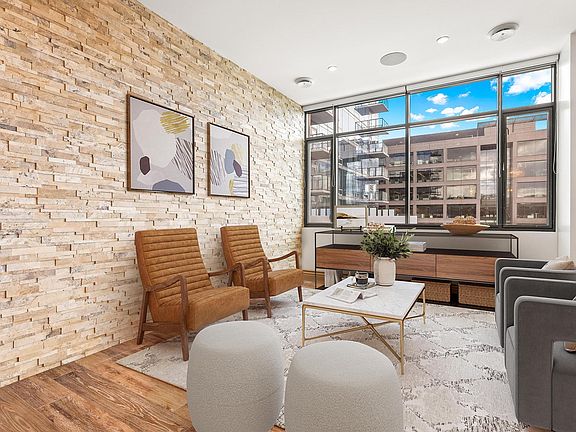 The chef's kitchen is a true centerpiece, featuring premium Sub-Zero range and oven, Miele dishwasher, granite countertops, and custom cabinetry. Designed for both cooking and entertaining, the kitchen flows seamlessly into the dining area, expansive living room, and an office nook, each space bathed in natural light from large windows. A stunning stone accent wall anchors the living area and adds a touch of elegance.
