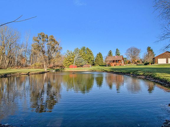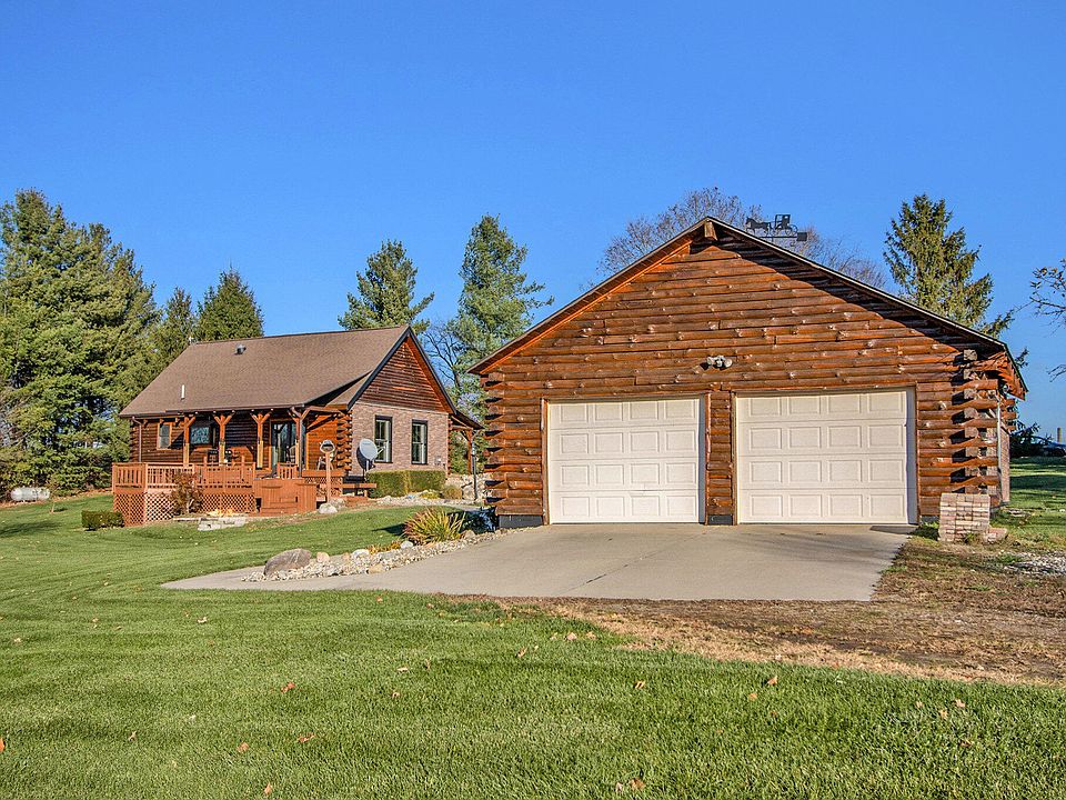 Spectacular Log Home on 2.45 Acres with Private Stocked Pond! This beautiful log home offers the perfect blend of rustic charm and modern comfort. Set on 2.45 serene acres, the property includes a private stocked pond with bluegill, bass, and turtles—an ideal retreat for nature lovers. Offering 2-3 bedrooms and 2 full baths, this home is move-in ready. The home features a walkout lower level, loft, and numerous recent improvements including a NEW furnace/AC, NEW pellet stove, complete basement remodel, NEW stacked-stone siding, and more. Inside, you'll love the warm, inviting atmosphere with a great room that flows seamlessly into the living room, highlighted by high ceilings and exposed wood beams. The kitchen showcases hickory cabinetry, solid-surface countertops, and all appliances included. The main-floor primary bedroom provides convenience, while the loft—with abundant closet space—serves as a spacious second bedroom. The walkout level adds fantastic additional living space with with a cozy family room featuring a pellet stove, an office, a potential third bedroom with electric gas-log fireplace, full bath, and laundry area. Exterior features include a 2-car detached garage, beautiful landscaping with 3 apple trees and 4 grapevines, a storage shed, generous chicken coop, and lean-to for firewood. Seller is also including the pond fountain, paddle boat, dock, and a brand-new washer and dryer. This log home is truly a must-see!