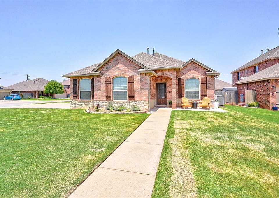 This lovely Home on a Corner Cul-de-sac Lot in Mustang Schools offers an Open Floor Plan with versatile 2nd Living Space, an Open Kitchen with Island, Pantry, Granite Counter Tops, and Dining Area, Living Area with Fireplace, Primary Bedroom with Garden Tub, Shower, Double Vanities and Walk in Closet in Primary Bathroom, Large Laundry Room, Side Entry Oversized Garage, Extended Covered Back Patio, and more!