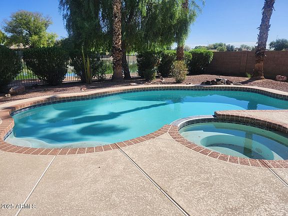 Lakefront retreat in Crystal Gardens! This 4 bed, 2.5 bath, 2,683 sq ft home sits on a cul-de-sac quarter-acre lot with fenced pool, spa, and lake views. Freshly painted inside & out. Kitchen features granite counters, island, and all NEW stainless appliances! Retreat into your Spacious primary suite with balcony, walk-in closet, dual vanities, garden tub & separate shower. Enjoy morning coffee and beautiful water views on your private balcony. Open-concept living, family room with fireplace, plus an upstairs loft for office/game room, family room with fireplace, 3-car garage + RV gate. Large backyard has mature trees and direct access to Community walking trails and urban fishing lakes. Minutes to I-10/Loop 101, shopping and dining. PETS welcome with landlord approval.