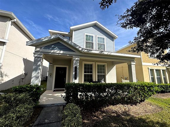 Welcome to your dream home in a picture-perfect neighborhood! This beautifully maintained 4-bedroom, 3-bath single-family residence offers charm, comfort, and convenience. Enjoy a spacious front porch on a calm, tree-lined street. The first floor features an open-concept living, dining, and kitchen area, perfect for entertaining, as well as a guest bedroom and full bathroom. Upstairs, an office area welcomes you. The large primary suite features a double-sink vanity, an upgraded shower, and a generous walk-in closet. Two additional bedrooms, a full bath, and a laundry room complete the second level. Step outside to your private retreat—fully fenced with a mature palm tree and plenty of space to relax. The detached 2-car garage and wide driveway provide ample parking. The neighborhood has a large resort-style pool, fitness center, clubhouse, playgrounds, basketball court, 3 dog parks, and beautiful ponds. Zoned for top A-rated schools (the elementary and middle schools are located within the neighborhood, and the High School is a few minutes away), the house is conveniently located near shopping, dining, Disney Parks, and major highways. Lovingly cared for by an owner who travels a lot for work, making the house lightly used single occupant year-round, this home offers a warm, welcoming atmosphere and has been kept in exceptional condition.
