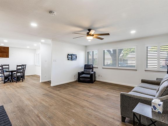 Open floor planStainless steel appliancesNew floorsDining areaKitchen with stone countertopsPlantation shutters