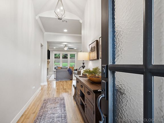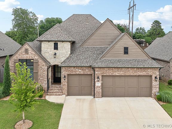 This exquisite and inviting must-see home boasts a seamless open floor plan adorned with premium upgrades $$$ throughout, offering a touch of luxury in every corner. Step onto White Oak floors and admire the elegant Olympus Contessa tile that graces all bathrooms, complemented by brushed nickel plumbing and light fixtures. Beyond the grand entrance, a dedicated home office awaits, featuring faulted ceiling, hand-crafted ceiling beams and French doors for a private workspace ideal for business calls or a home-based enterprise. The heart of the home unfolds in the open main living area, showcasing a striking floor-to-ceiling stone fireplace nestled between custom shelving and storage. Prepare culinary delights in the dream kitchen, complete with a sprawling granite-topped center island with undercounter storage, walk-in pantry, stainless steel appliances, custom marble backsplash, under-counter lighting, and a convenient and desirable pot-filler above the gas cooktop range. Retreat to the spacious primary bedroom featuring an ensuite bathroom with a separate tub, a luxurious full-tile walk-in shower with a frameless glass door, and a generous pass-through closet with towering 11-foot ceilings for ample storage. Enjoy direct access to the laundry / work area featuring extra above and below storage, conveniently connected to the garage entry with additional built-in storage cabinets. Step outside to the covered patio, plumbed with gas for a barbeque or outdoor kitchen, creating an ideal space for entertaining or unwinding with your favorite meal. The expansive 3-car garage offers ample space for your vehicles, with an impressive oversized, floored attic providing additional storage options. Conveniently located with easy access to HWY 75 and Creek Turnpike, this home ensures swift connectivity to Tulsa and all surrounding areas. Please note that the listing agent is related to the seller.