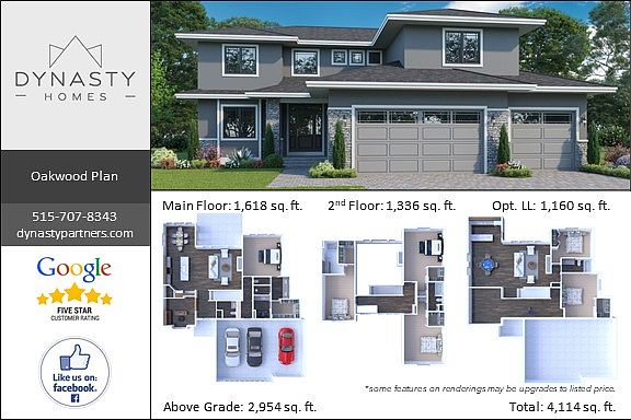 Welcome to Dynasty's Oakwood 1.5 story plan. Spanning 2,954 square feet on the upper two floors, the layout makes everyday living a breeze with main floor office and master bedroom. The Oakwood plan features three upstairs bedrooms, a guest suite along with a split J&J bedroom/bath and a loft! The kitchen in the Oakwood plan features a large island, walk in pantry and dining room. The kitchen and dining room are open to the family room with tall ceilings, creating the perfect open layout. The master suite is complete with a walk-in tile shower and large walk-in closet. Master closet is connected to the laundry with mud room pass through! The optional basement finish is complete with an additional bedroom, bath, large family room with bar and game area. Please note starting prices are subject to adjustments for lot premiums, exterior elevation upgrades, basement finish and other upgrades not included. Prices are subject to change without notice. Photos may include upgrades not included.