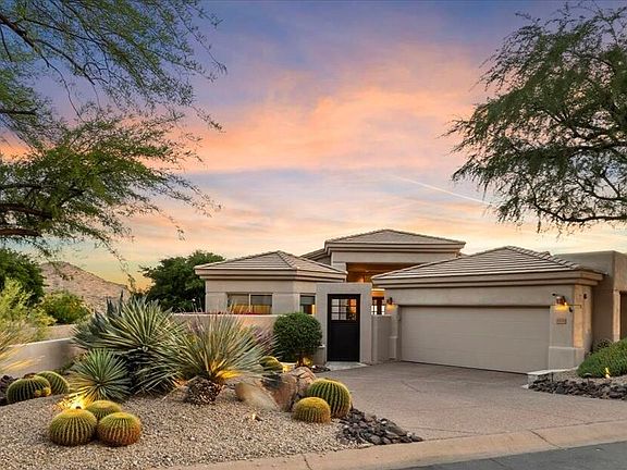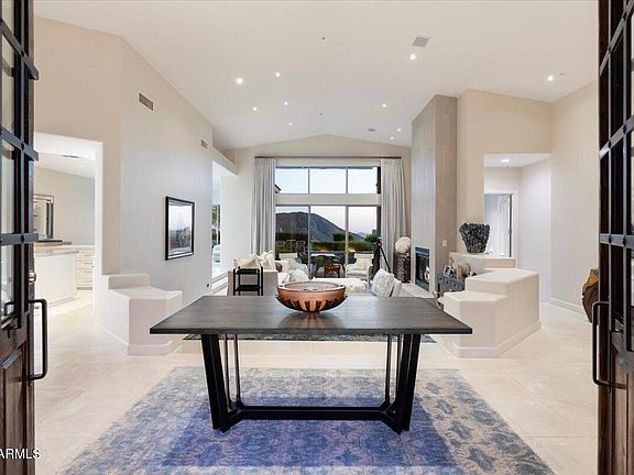 This elegantly updated home exudes sophistication and luxury, capturing the essence of upscale living in the prestigious Quail Ridge community. The setting, perched high on the South Face of Troon Mountain with a Southwest Orientation promises unparalleled views of the surrounding boulder landscapes, the majestic McDowell Mountains to breathtaking sunsets and city lights. The attention to detail is evident from the moment you enter the spacious courtyard, with custom doors leading to a grand foyer.