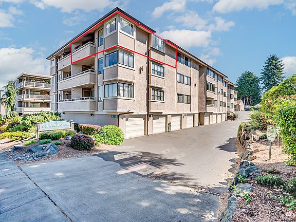 Very spacious (1200+ sq ft) 2 bedroom, 1.75 bath top floor corner unit (SW corner) with 1 car garage. Views of the Sound, ferries, Olympics, & Whidbey Island located in Edmonds Bowl very close to downtown! All NEW interior paint including cabinets & millwork, & all NEW carpeting. Open floor plan with bright & airy feel. Great room with fireplace & vaulted ceilings, huge eating nook with skylights & door to private view deck, large primary bedroom with 3/4 bath, & walk-in utility room. Excellent guest parking. NEW hot water tank & NEW washer/dryer. Remodeled entrance & NEW elevator. Immediate access to shops, restaurants, beaches, ferry, New Edmonds Waterfront Center, Art Theater, & more!