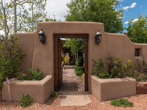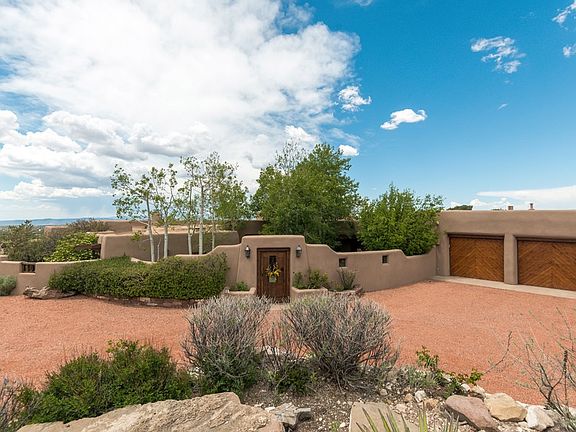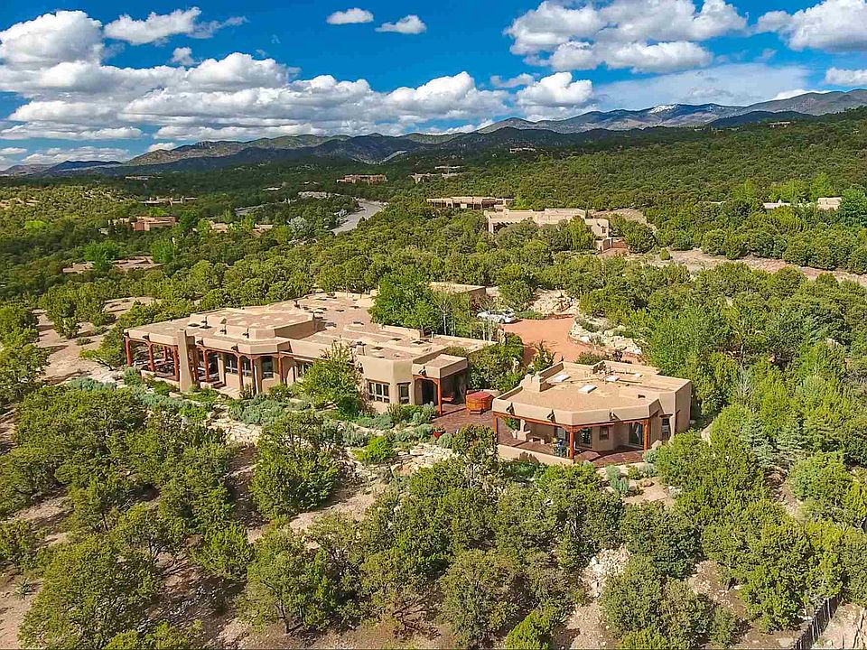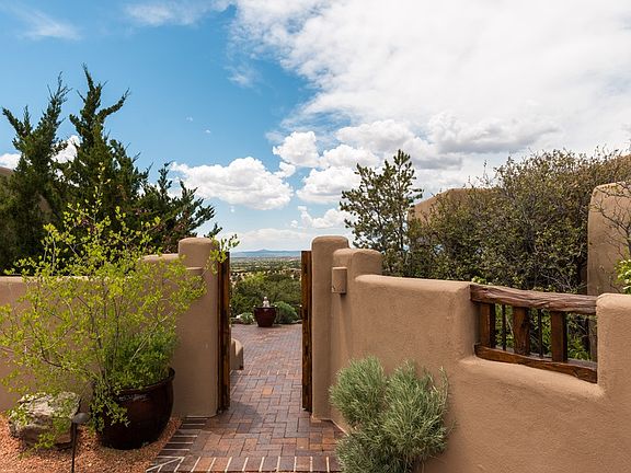 In the hills north of downtown Santa Fe, this 4,790-square-foot residence and including a very private guesthouse combines elegant Southwestern style with inviting spaces and majestic views of mountains and sunsets. The generous, versatile floor plan includes a multitude of options for magnificent indoor-outdoor living and entertaining, a well-appointed open kitchen, and two separate bedroom wings--a master suite and office secluded in one and two guest bedrooms and a study in the other. Rich hues of wood and stone contribute to a natural warmth, and nearly every space is filled with wonderful light from windows and skylights. Closet and storage space is plentiful, with a storage room included in the oversized three-car garage. A colorful garden courtyard is a peaceful oasis filled with trees and flowering plants, while a series of patios and portales running along the western side of the home and guesthouse were designed for outdoor living and entertaining while appreciating breathtaking vistas. The very private guesthouse has its own portal, living and kitchen spaces, a quiet bedroom, and easy access to an open air patio perfect for a hot tub.