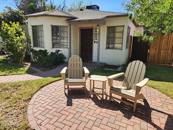Historic home in the heart of the highly desired Woodlea-Melrose District! The main house offers 2 bedrooms/1 bath, 979 sq.ft. with charming kitchen, bay window dining area and large light-filled living room. A detached 1 bed/1 bath 360 sq ft.guest house with wood floors and laundry adds flexibility. Enjoy a lush front yard shaded by a beautiful Carob tree and a backyard retreat with gardening beds on drip. New HVAC, new water heater, and lined sewer plus an EV charger! Close to coffee shops, award-winning restaurants, vintage stores, and nightlife in one of Phoenix's most community-focused neighborhoods, with monthly gatherings, block parties, celebrations, little Libraries, and even a neighborhood Lending Tool Shed.