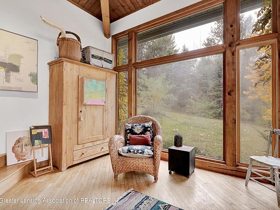 Beautiful 3 bed home for sale on over 11 acres of land. Your own private oasis! Huge deck overlooking wildlife and trees. Large windows in almost every room offer lots of natural light. Open floor plan with spacious living room area. Home office opportunity and extra space for storage. Barn offers 1000 sq ft. Home designed by Michigan Architect Gordon Fineout