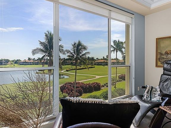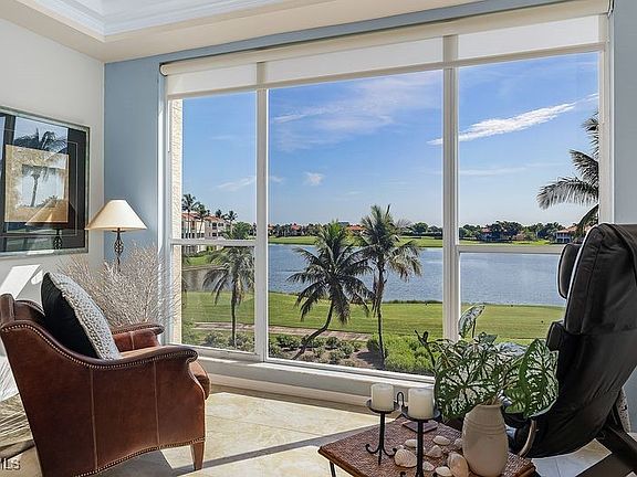 Panoramic Lake and Golf Course Views through Floor to Ceiling Window Wall. Bellavista 3rd floor Cortina Model with 2 Bedrooms, 2 Baths and Large Den in Prestigious Gulf Harbour Yacht & Country Club. White Kitchen with Granite Counters, Stainless Appliances, Breakfast Bar, all with a View. Living area has Ceramic Tile and Engineered Wood in the Den. Both the Living Room and Primary Bedroom Suite has access to the Tiled Lanai also with Great Views. Primary Bedroom has Private Bath with His and Hers Sinks, Shower and a Bathtub. Furniture-Furnishings negotiable, Crown Molding throughout, Tray Ceiling in Living Room, Den has 10 Pane Glass French Doors, Guest Bedroom and Den has Room Darkening Shades. Elevator to Large Breezeway with Storage Room right Outside the Front Door. AC and Stove New 2025, Water Heater is Tankless for Extra Storage, Full Size stacked Washer & Dryer, Big 2 Car Garage, Walk to Country Club and Marina. Square footage approximate or from Lee County. Some amenities herein available but not offered. If desired Country Club membership purchase is required for club amenities. Country Club Memberships available for purchase but not mandatory. See Attachments & Photos for information regarding the Renovation of the Country Club.