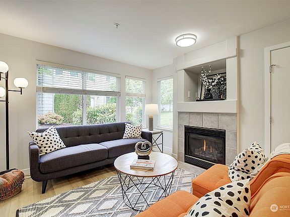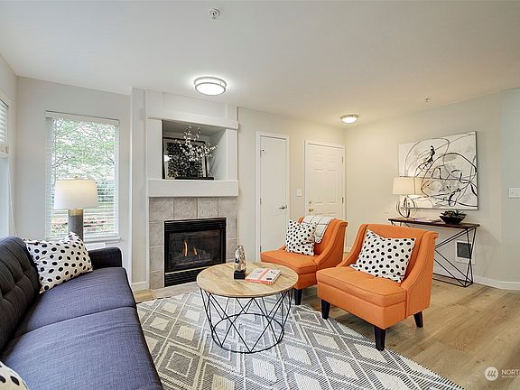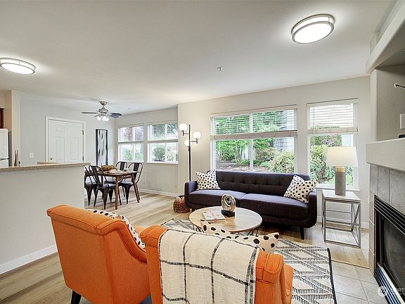 Completely renovated, meticulously maintained ground floor, end unit in gated community. Convenient located within walking distance of shopping, bus lines + an easy commute to SR-167. Open & inviting floor plan, spacious yet cozy living room includes gas fireplace where gas is covered by HOA Dues. Owner's suite with huge walk-in closet. Enjoy beautiful updates and new hardwoods throughout, brand-new washer/dryer, carpet, countertop, cabinets, and freshly painted walls. Amenities include gated sports court, exercise room & club house. Welcome Home!