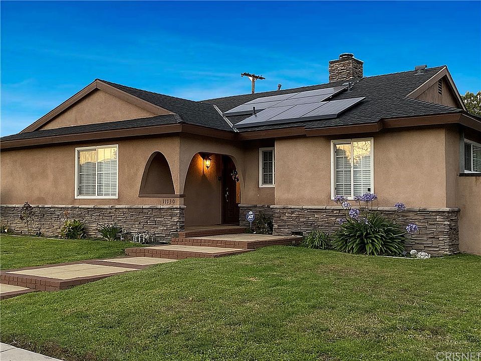 Highly Upgraded Granada Hills Pool Home with RV Parking! Impressive front landscaping with stacked stone and stucco exterior. Lush green grass with brick decorated walkway. This home features a Newer Roof, New Paint, New AC Unit, Tankless Water Heater, Owned Water Softner, Upgraded Electric Panel, Newer double pane windows and glass sliding doors with blinds inside the glass! Enter into this charming home with Hardwood Floors that extend through most of the home. Bedrooms. Kitchen, Family Room and Bathrooms feature Beautiful Rectangular Ceramic Tile Flooring in Light Gray. Completely Renovated Bathrooms, Recessed Lighting in All Rooms, Crown Molding, Decorated Stacked Stone Gas Fireplace. The Kitchen is Spacious with Granite Countertop with Full Backsplash accented by Stainless Sink, Faucet, Cook Top, Microwave, Range Hood, Built in Oven and Giant Pantry Area. Outside is Ready For Entertaining or Enjoying Hot Summers with a Giant Pool and Spa Re-plastered Only 2 Years Ago. Enjoy Privacy in this yard with no neighbor windows in view and stucco block walls. Pool has a fence that can be used for safety or taken down. Spacious side yards with fruit trees and room to safely park RV or Boat. Garage Converted into an Office Space however makes a great guest area or game room with Bathroom, Shower and Sink. No Permit on garage bathroom but can be returned to a garage space.