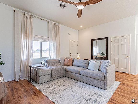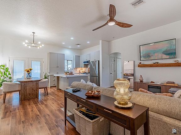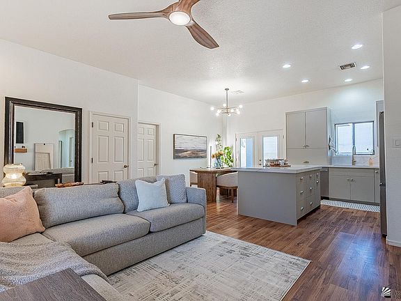 A true desert southwest gem, this Wildflower beauty built by The Development Group and meticulously remodeled, is dream home worthy! Backing up to open BLM land, this stylish Santa Fe–style home offers rare privacy and unobstructed mountain views with miles of off-roading trails just steps away. Inside, every detail has been thoughtfully updated—starting with a stunning kitchen featuring sleek cabinetry with maximized storage including an appliance garage, quartz countertops and backsplash, and stainless-steel finishes. Both bathrooms have also been renovated with designer finishes, including brushed gold hardware, custom tilework, and modern vanities that add a touch of spa-like luxury. The primary suite features a refreshed ensuite bath and tranquil backyard views. Enjoy low-maintenance desert landscaping, a spacious side yard with RV gate, and the peace of mind of living with no rear neighbors—just endless desert horizons.