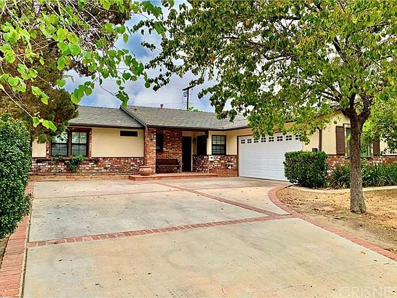 Wonderful Granada Hills single story just waiting to be called HOME! Encompassing 3 bedrooms, 2 full baths and a light filled floor plan on a large, possible pool sized lot the possibilities are endless! A brick trimmed driveway leads to a charming front porch, and interior highlights of gleaming wood laminate floors, smooth ceilings, some updated dual pane windows, a spacious living room warmed by a cozy fireplace and a beautiful bay window in the dining area. A tiled kitchen boasts breakfast area, built-in appliances and tons of cabinet space. All bedrooms are good sized and both bathrooms have been updated with travertine. Rear yard offers an expansive covered patio, built-in BBQ, numerous fruit trees and is ready for your imagination. Direct access 2 car garage, central air & heat, a convenient central location make this one a true WINNER! Dont let it get away!