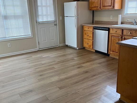 2 bedroom, 2 full bath duplex . Rooms are all large. Living room has a vaulted ceiling and a ceiling fan. Kitchen has a refrigerator, stove, dishwasher, and microwave with an eat-in area. Master bedroom has a walk-in closet and a full bath with a shower. Hall bath has 2 sinks and a tub/shower. Both bedrooms are large. There is a concrete patio on back. There are washer-dryer hookups in the hallway closet. Floors are LVP plank flooring and bathrooms have ceramic tile.