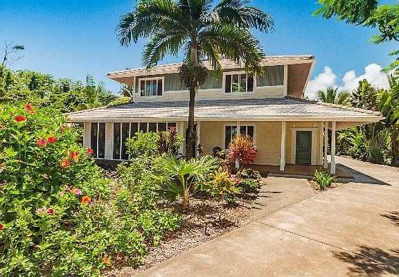 Island inspiration never looked so good! This simply stunning home located across from the ocean enjoys beautiful ocean views and cool tradewinds but being so close to the ocean requires extra consideration and design detail. All construction details necessary to enjoy longevity and maintenance free living were incorporated by the original owner. Even the landscaping has been designed to be ez care yet beautiful. Enter the main living space to a great room which opens to a huge screened lanai that is accessed thru double doors. Pre-wired for your sound system, there's even a pull-out TV cabinet that tucks your AV system neatly away. The kitchen with all the bells and whistles is perfectly appointed with stunning rainforest granite, solid cabinetry with crown molding, deep pot drawers, bar sink, breakfast bar, stainless steel appliances and judiciously placed glass front bamboo styled cabinet doors. Reached by a regal stairway, the bonus room was designed so that it could be easily be converted to bedroom 3. As you enter the master thru double doors, you can't help but notice the beautiful ocean view. Whale watching anyone? The huge master bath with double sinks leads to what would be best described as a dressing room than a walk-in closet. It's huge! Also, located on this level, the laundry features a combo washer/dryer. A large guest bedroom located on this level spans the width of the rear portion of the home. But there's more! The soaking pool is equipped with a passive solar heating system. Located steps away, the outdoor shower is perfectly situated to service both the pool area or beach clean-up! This is one that will truly make your island living dreams come true!