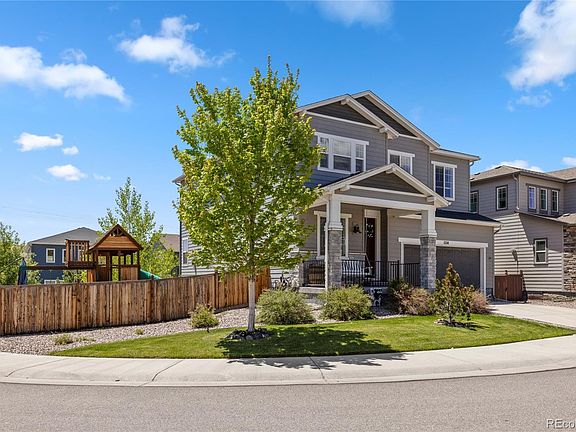 This stunning 4-bedroom, 4-bath home sits on a desirable corner lot and offers over 3,600 finished square feet of thoughtfully designed living space. Soaring high ceilings, an open concept layout, and abundant natural light create a warm and inviting atmosphere from the moment you step inside. The kitchen is a chef’s dream, complete with a large island, double ovens, gas range, stainless steel appliances, and ample cabinet space. Off the kitchen, you'll find a cozy dining area and a spacious living room perfect for entertaining or relaxing with family. Work from home in the dedicated main-floor office, and enjoy extra space to unwind in the upstairs loft. The luxurious primary bedroom features an en suite bathroom and a generous walk-in closet, while two additional upstairs bedrooms share a full bath. Convenient upstairs laundry includes built-in cabinets for added storage. The fully finished walk-out basement offers a large family room, a 4th bedroom, and a full bath—ideal for guests. Outdoor living is a highlight with a covered front porch, a retractable awning over the back deck, and a beautifully landscaped backyard with new mulch and a covered patio—perfect for enjoying Colorado’s sunshine. Located in a vibrant community with walking trails, parks, playgrounds, a clubhouse, and a pool, plus close proximity to schools and public spaces—this home truly has it all. Don’t miss your chance to own this exceptional home in one of Castle Rock’s most sought-after neighborhoods!
