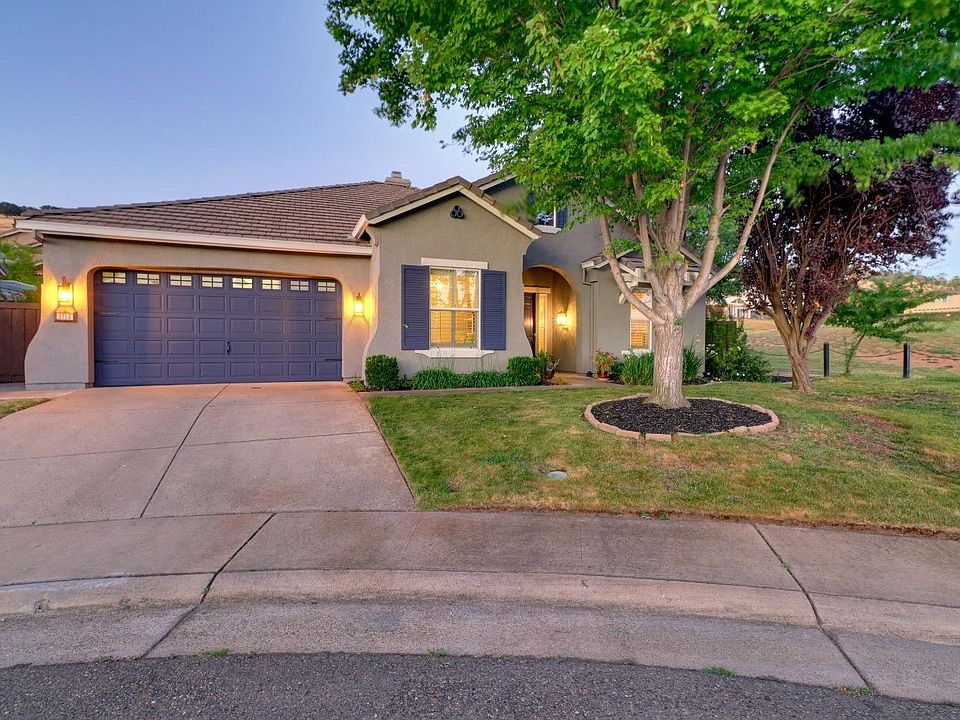 Explore this exquisite single-story home positioned on a prime cul-de-sac lot, boasting views of Empire Ranch Golf Course. The desirable layout includes a formal living room with a gas fireplace and a dining area adorned with a chic modern chandelier. The family room invites relaxation with a second gas fireplace, built-in media center, and expansive picture windows that frame the backyard. The kitchen, designed for entertaining, features stainless steel appliances, abundant cabinet space, and expansive granite and limestone countertops. Casual dining is a delight with bar seating at the countertop and a breakfast nook, enhanced by a stunning new pendant light. Engineered hardwood and tile flooring throughout, along with numerous updates, ensure this home is ready for immediate occupancy. Savor the golf course sunset views from the manicured backyard, complete with a large patio and distinct seating zones. Embrace the opportunity to live in the esteemed Empire Ranch Community, celebrated for its top-tier schools and scenic nature trails, while enjoying proximity to shopping, dining, parks, and the allure of Folsom Lake.