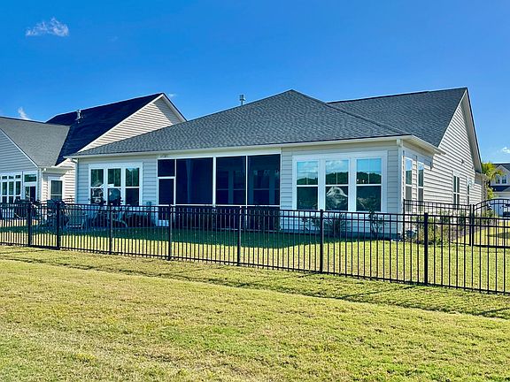 Welcome a stunning single-level retreat in the sought-after Horizons 55+ community. This special Juniper model, no longer in production, offers the look and feel of new construction without the wait. With 4 bedrooms and 3 baths, this home delivers modern living at its finest, featuring an open-concept design, abundant natural light, and a premier lakeside view along the entire rear of the home.The residence provides single-level living with premium finishes, including 10-foot ceilings and 8-foot doors throughout to create an expansive, airy ambiance. Thoughtful upgrades add refined detail and lasting appeal. Enjoy the serene lakeside from multiple living areas and the spacious screened porch, delivering a tranquil for everyday living and entertaining.The kitchen is a chef-inspired centerpiece with quartz countertops, a subway tile backsplash, a large walk-in pantry, and a substantial island. Recessed lighting plus pendant fixtures over the island provide a bright, contemporary workspace. The dining room features elegant wainscoting, while crown molding accents the foyer, hallways, kitchen, living room, and primary suite for a cohesive, crafted feel. The owner's suite shines with a tray ceiling and an ensuite bathroom offering a zero-entry shower with frameless glass doors, complemented by a generous walk-in closet. Smart window treatments and lighting enhance the interior, with cellular shades in the living room and kitchen, cordless Levolor blinds in bedrooms and dining, and updated lighting throughout for a clean, uncluttered aesthetic. Interior upgrades include shiplap accents in the laundry room, kitchen island, and the garage-to-hallway custom built drop zone, ensuring texture and warmth, along with ceiling fans with separate switches for comfort. Outside, a three-car garage accommodates vehicles and storage, while a large screened porch overlooks the nearly complete amenity center with indoor and outdoor pools. A 10x10 paver patio with a BBQ grill bump-out, a black aluminum backyard fence, and a front-yard palm tree boost curb appeal. HOA mows the lawn and refreshes flowerbeds twice a year, simplifying maintenance. This home blends luxury, convenience, and a premier lakeside setting all on one level.