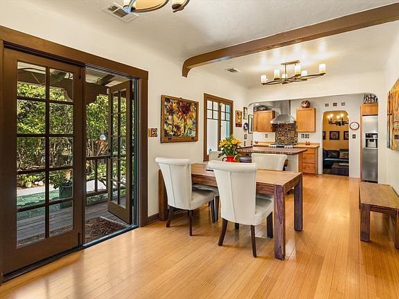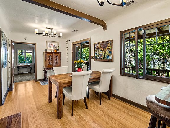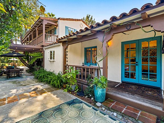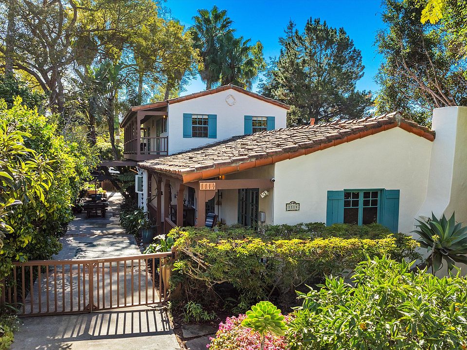 Step into a world of timeless elegance with this enchanting 1920s Spanish Colonial Revival home, where architectural integrity meets a lush, storybook garden. A striking terra-cotta-tiled gabled rooftop crowns the residence, setting the stage for a truly captivating retreat. Beyond the charming façade, a private oasis unfolds—towering hedges embrace the property, creating an intimate haven for al fresco evenings under the stars. Meandering pathways lead you through a botanical paradise, where vibrant tropical foliage mingles with fruit-laden trees—grapefruit, lemons, apples, tangerines, and figs—just outside your front door. The garden offers secret pockets of serenity, with thoughtfully placed seating areas that invite you to linger, dream, and escape into nature's embrace. Entering through the front door feels like traveling back in time. The living room, adorned with vaulted wood ceilings and a picturesque window, bathes the space in natural light. The dining room and kitchen seamlessly blend warmth and charm, featuring butcher block countertops, rich maple cabinetry, and decorative Spanish tilea delightful setting for gathering and making memories. Off the kitchen, is an inviting bedroom ensuite and a cozy family room beckon, the latter offering a mesmerizing view of a wine cellaran ode to the true wine connoisseur.