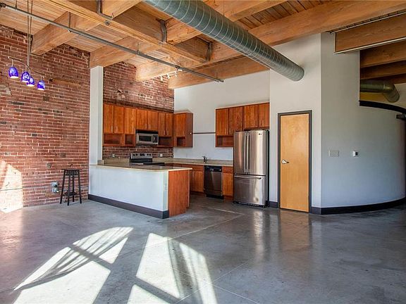 Open concept livingGranite countertopsExposed brickStainless appliancesHuge windowsWood plank ceilings