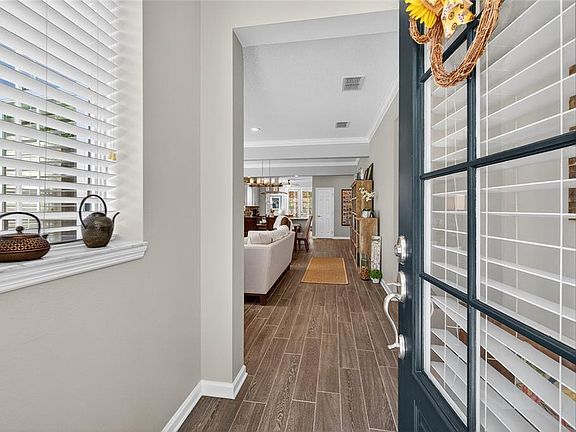 This SINGLE-STORY home boasts a TOTAL RENOVATION: * An OPEN, flowing FLOOR PLAN from the ENTRY FOYER through the GATHERING/ ENTERTAINMENT ROOM, the DINING AREA, and the KITCHEN that blends into the SCREENED BACK PORCH! Luxury Sedona Silver Oak Porcelain Wood Look Tile Planking flows throughout the living areas and the bedrooms. The entire home is freshly painted with a neutral palette of Greige. All door hardware and hinges are satin nickel to coordinate the color palette of the home. The KITCHEN features: Soft Close handsome Silk color Cabinets, a custom Stainless signature outside-vented HOOD, Eat-In Area and countertop seating, 2021 Expansive White Spring Granite Countertops, GE Stainless Double Oven, Dishwasher, A GE Profile Cooktop and a Pantry with a convenient Niche for the Microwave. The PRIMARY BEDROOM suite offers: An Extra-Large Closet with Custom Built-ins and TWO entries (from the bedroom and from the bathroom), The Primary Bathroom features double elevated vanities with Lighted mirror, Grandview Smoke Stone Glazed porcelain flooring and a very large walk-in shower with custom listello tile inlay. TWO ADDITIONAL Front BEDROOMS each with Large double door closets and built-in shelving and a shared Full Bath make this a popular split floor plan. The GATHERING/ENTERTAINMENT ROOM is always filled with natural light with its numerous windows and offers a Built-in Bar with Beverage Refrigerator. The LAUNDRY ROOM has a Steam Plus full-size Washer and Dryer and handy storage cabinets. The TWO CAR GARAGE additional XL parking pad offers plenty of space for guests. ENERGY SAVING too: NEW ROOF 2023, 2018 AC system with electronic air cleaner/filtration system. The Lovely Screened Porch off the Kitchen extends your Entertainment area with a view of a charming back yard with lush landscaping such as fragrant flowering Plumeria and bird feeders. The front of the home faces a beautiful passive park decorated with colorful Mosaic sculptures! Artisan Park Residents enjoy their coveted private Amenities: Heated Resort Pool with saltwater system and Spa, Outdoor Kitchen, Fireplace and covered patio for parties and WIFI connected! Restaurant with Full Dining Room and Bar plus Banquet Room for Parties and Events. A Full Activity Schedule every week too! A state-of-the-art Fitness center and Billiard Room provide fun and fitness!