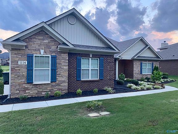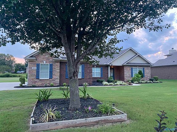 Full brick rancher with stone accents. Home is conveniently located near schools, grocery stores, restaurants, shopping & Redstone Arsenal. Foyer, formal dining room, living room, kitchen & hallway have gorgeous wood floors. Kitchen has an island with built-in storage, huge pantry, beautiful wood cabinets, eat-in breakfast area. Isolated Owners suite with oversized, well-designed glamour bath, huge walk-in closet. Two secondary bedrooms share a full bathroom & have walk-in closets. Covered back patio overlooking the large flat backyard is a perfect way to enjoy magnificent sunsets. Beautifully landscaped, flowers, irrigation system. Storage room in garage. Turnkey & ready for new owners.