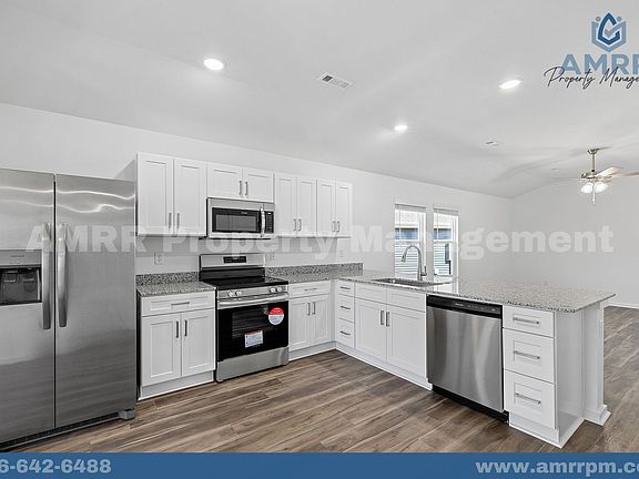 This specific home is 1,550 square feet and features 4 bedrooms, 2 baths, and a 2 car garage. The kitchen comes with granite countertops and ALL kitchen appliances; a new fridge, dishwasher, stove, and a microwave. There are also custom cabinets and vinyl flooring that extends throughout the home, which means NO carpet to clean!