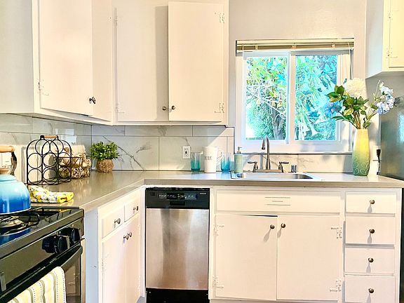 This fantastic ground floor 2 bedroom unit is in a great Albany location, just about a block from vibrant Gilman St., with excellent shopping and restaurants nearby and a couple of streets above San Pablo Ave. This tree-lined street has mostly single-family homes. This updated apartment features hardwood floors and new windows on all sides which let in lots of natural light. The large kitchen has a door to the garden, room for a breakfast table across from the back door, quartz stone countertops, stainless appliances including a dishwasher and stylish tile work. A hallway with a separate hall coat closet and a separate linen closet leads from the living room to the bedrooms and bathroom. There is also a large closet in each bedroom. The apartment is on the back side of the 4-unit building with a common peaceful backyard. A one-car garage is included with the rent. A separate laundry room is off of the backyard with app or coin-operated laundry machines. Top-rated Albany schools. An indoor cat would be considered.