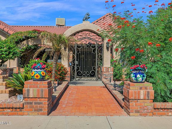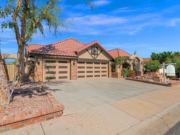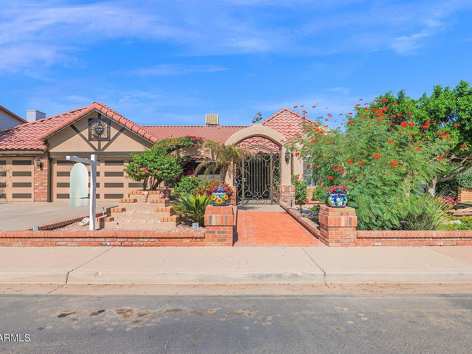 Welcome to a 4-bedroom retreat in coveted Dobson Woods, lovingly cared for and maintained by the original owner. Enter through a private gated courtyard framed by lush greenery into 2,408 sq. ft. of inviting living space. The kitchen features extensive granite counters, stainless steel appliances, crown molding, and a charming bay window. Enjoy a separate living room and a family room fireplace perfect for cool winter evenings. The primary suite offers two closets, shutters, and private backyard access. Outside, your resort-style oasis awaits with a sparkling pool, covered patio, and vibrant landscaping. Additional highlights include new paint (2023), updated carpet, tile in all the right places, solar panels, and a 3-car garage—all blending comfort, style, and care-free living.