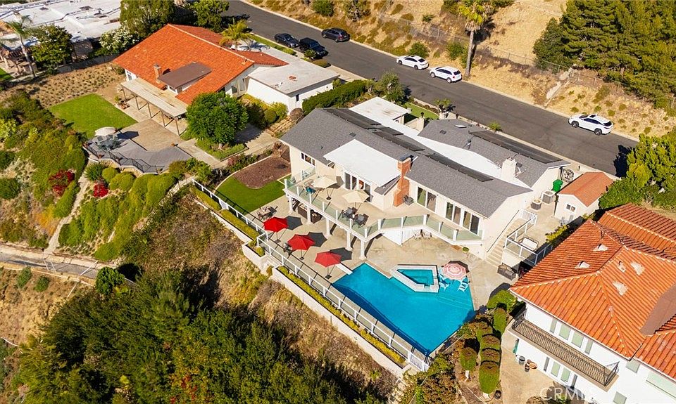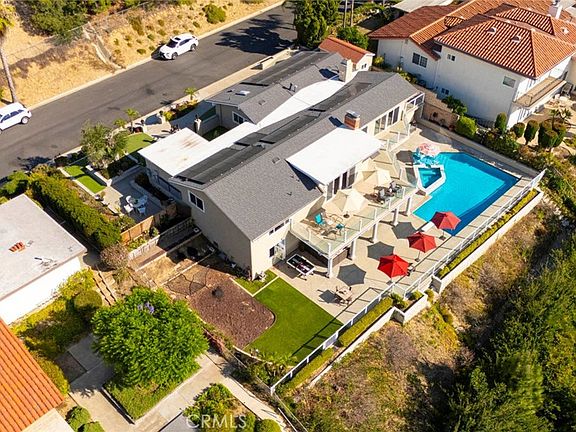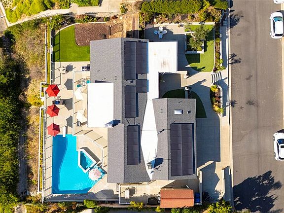 Stunning Single Story 180 Degree Unobstructed View Home with Additional Multigenerational Living Quarters on the bottom level in Prestigious North Tustin Foothills/ Lemon Heights. LOCATION HIGHLIGHTS: • Located in the highly desirable North Tustin Foothills in the Lemon Heights community • Situated on a quiet, single-loaded street • Directly above Arroyo Elementary, Hewes Middle, and Foothill High • Incredible 180 Degree Unobstructed panoramic views: • Direct site lines to Angels Stadium, Disneyland, Downtown LA, and Hollywood Sign (on clear days) • Catalina Island and San Pedro Port to the west • San Bernardino Mountains to the east • Close to scenic Peter’s Canyon Loop Trail. HOME FEATURES: • 4 Bedrooms | 3 Bathrooms | 3042 total Sq Ft | 0.43 Acres (2096 Sq Ft upper level and 946 Sq Ft lower level) • Three fireplaces (2 upstairs and 1 downstairs) • 3-car attached garage • Salt Water Pool & Jacuzzi • Newer roof, solar system, and main electrical panel upgrade (2023) • Tiered retaining wall (2022) • $400,000 in structural upgrades & maintenance (2016-2025). UPSTAIRS (MAIN LIVING LEVEL): • 3 Bedrooms + Office | 2 ½ Bathrooms • Spacious living & dining rooms with large sliding glass doors opening to full-width exterior view balcony • Upstairs balcony 598 Sq Ft • Primary bedroom with newly remodeled ensuite bathroom (2021) • Two secondary bedrooms share a full shower/tub bathroom • Private office with fireplace and direct balcony access (Could be another bedroom) • Laundry area in garage and Tuff Shed for storage. DOWNSTAIRS: (Additional living quarters for multi-generational living, rental or In-Law Suite): • 1 Bedroom | 1 Bathroom with private entrance • Includes living, dining, kitchen (electric cooktop), fireplace, and electrical stackable laundry • 540 Sq Ft covered outdoor living area • Additional outdoor storage unit • Direct access to pool and jacuzzi • Ideal for rental income.